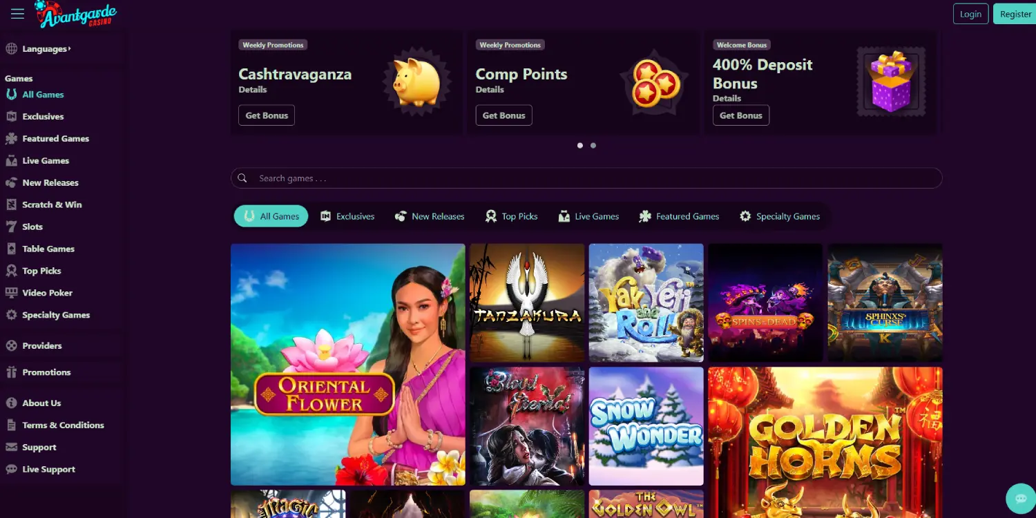 The most prominent game providers featured at Avantgarde Casino are Rival, Vivo, and Betsoft. As for the games, we recommend you test Thai Blossoms, Riptide’s Treasures, and Luck of the Irish, all of which are currently featured on the home page.